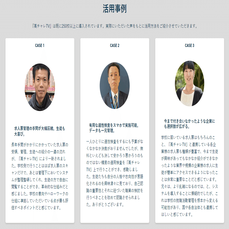 一人ひとりに適性検査をするにも予算がなくなかなか決裁がおりませんでしたが、無料といえども決して安かろう悪かろうのものではない精度の適用検査を『高チャレTV』上で行うことができ、感動しました。